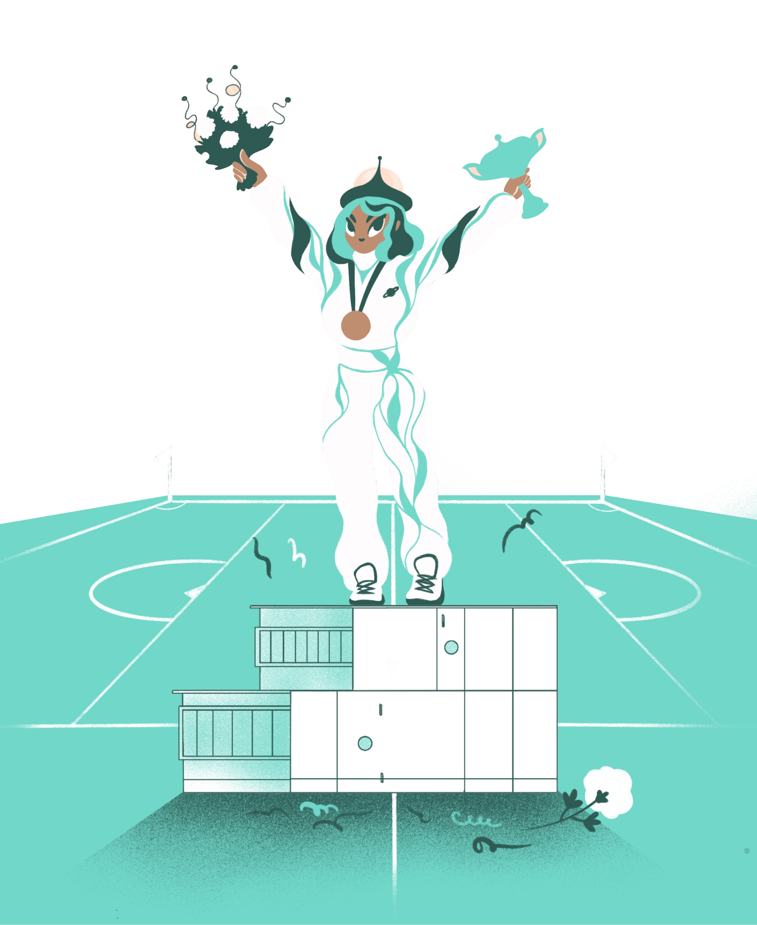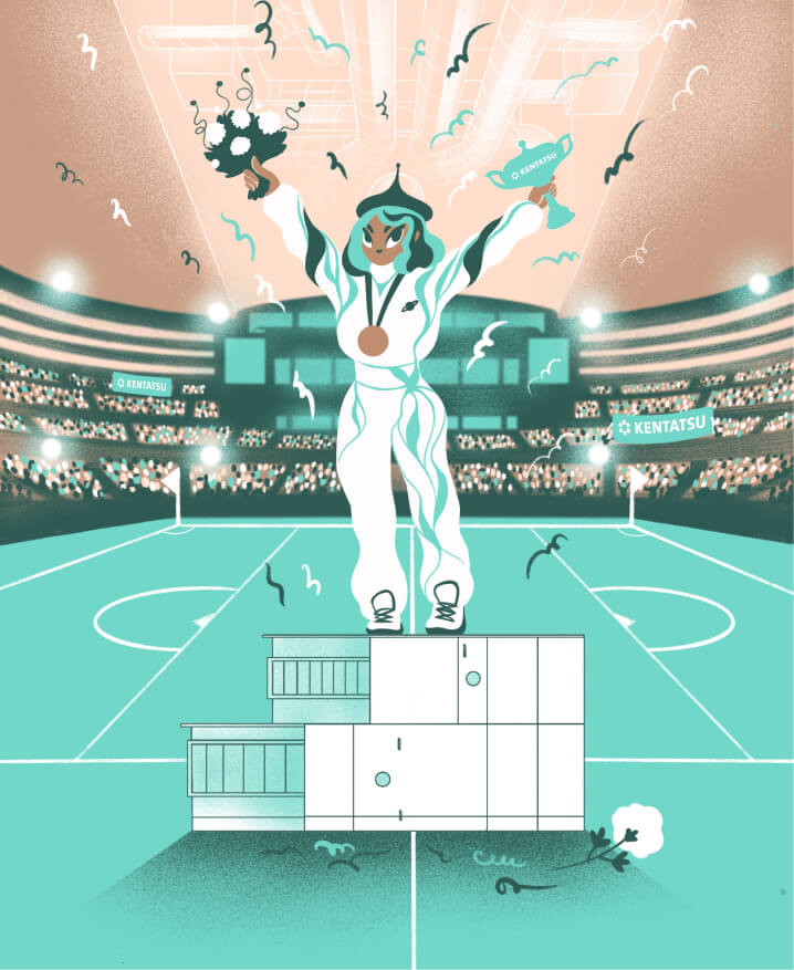 Перед нами — стадион и награждение победителей межгалактических соревнований. Стадион крытый, под потолком можно увидеть круглые серебристые воздуховоды. На трибунах болельщики держат флаг с лого Kentatsu, а на пьедестале почета стоит спортсмен с брендированным кубком в руках. В форме ступеней пьедестала считывается форма вентиляционной установки. Вентиляция Кентацу — выбор чемпионов!