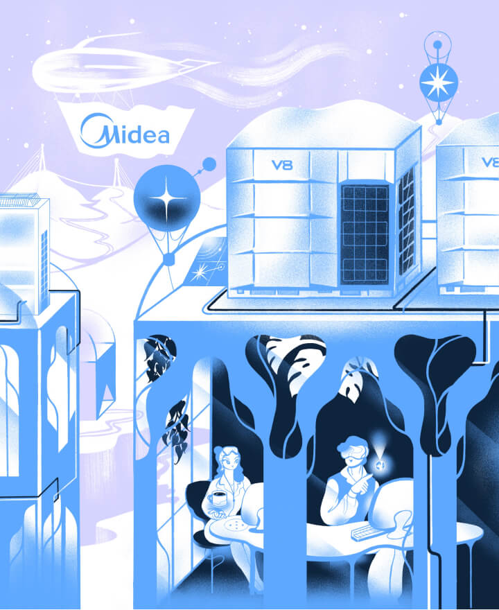 В городе будущего, где небо бороздят космические корабли и дирижабли, на крышах офисных зданий установлены VRF-системы Midea V8. Они отвечают за инновационные технологии в создании комфортного климата.