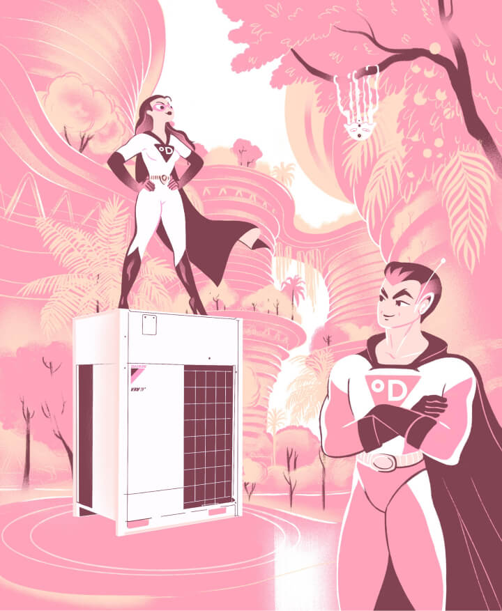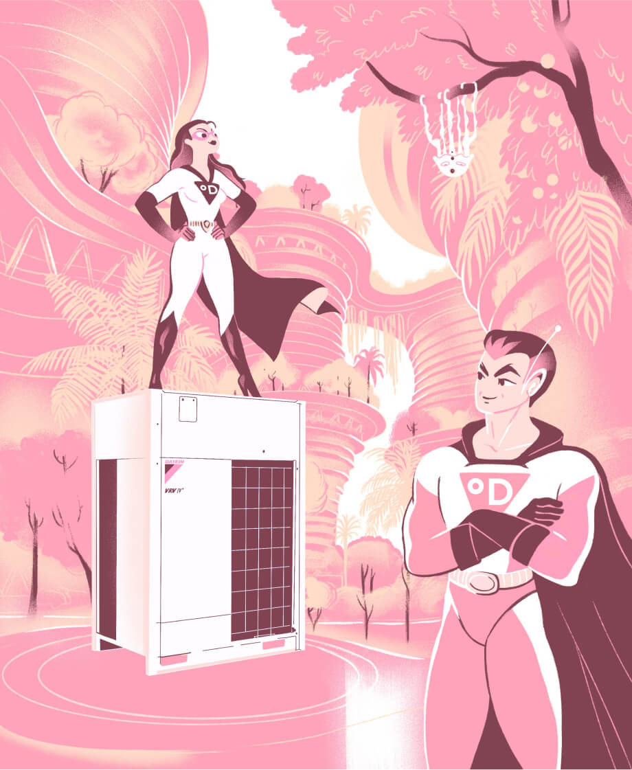 На иллюстрации объединяется идея оживленного мегаполиса и близости к природе, олицетворяющая философию Daikin о технологичности и заботе об окружающей среде. У бренда есть образы супергероев, которые были вписаны в сюжет. Фоновый вид на небоскребы, зелень и деревья вдохновлены жилыми вертикальными садами в Милане (Bosco Verticale) и знаменитым футуристичным парком Gardens by the Bay в Сингапуре.