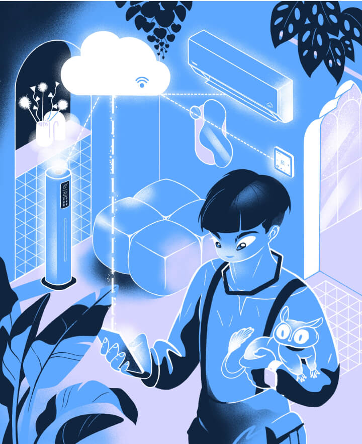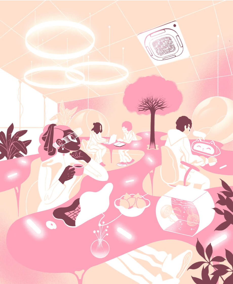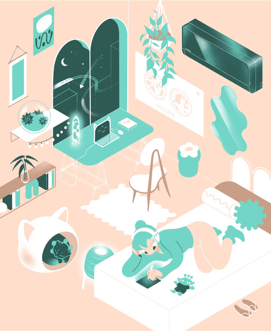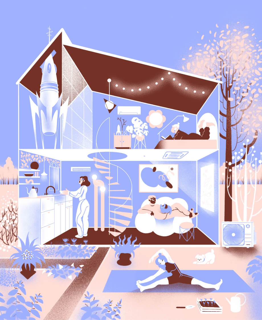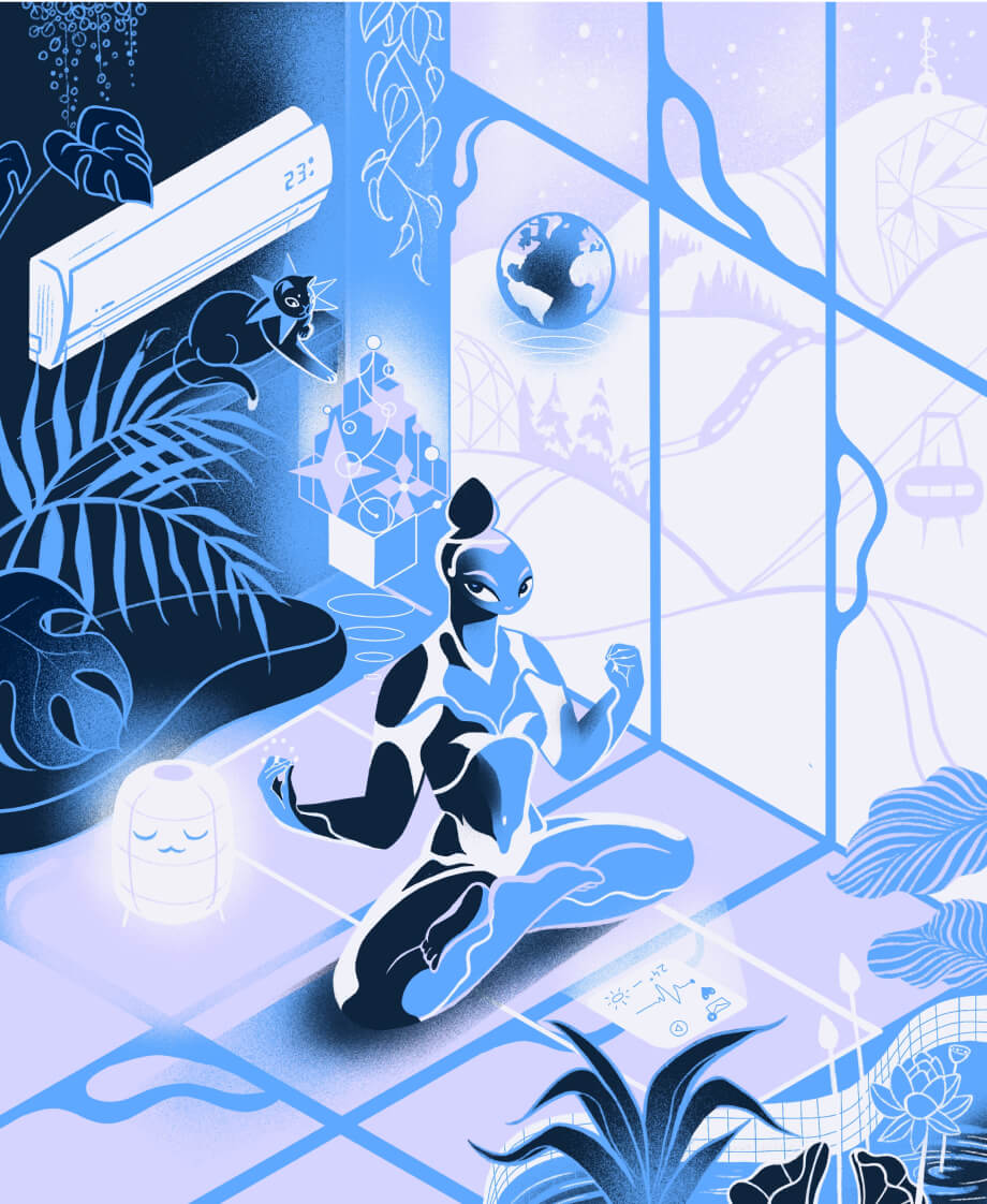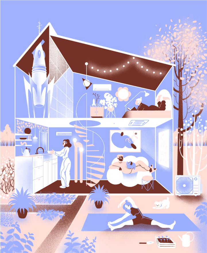 Героем каждого месяца стала техника из продуктового портфеля Даичи. Мы пофантазировали, каким будет мир через 100 лет и придумали 12 сюжетов с участием климатического оборудования наших брендов, а иллюстраторское агентство Bang! Bang!➚ помогло нам визуализировать идею в уникальном авторском стиле.
