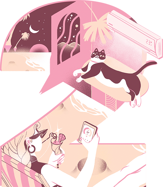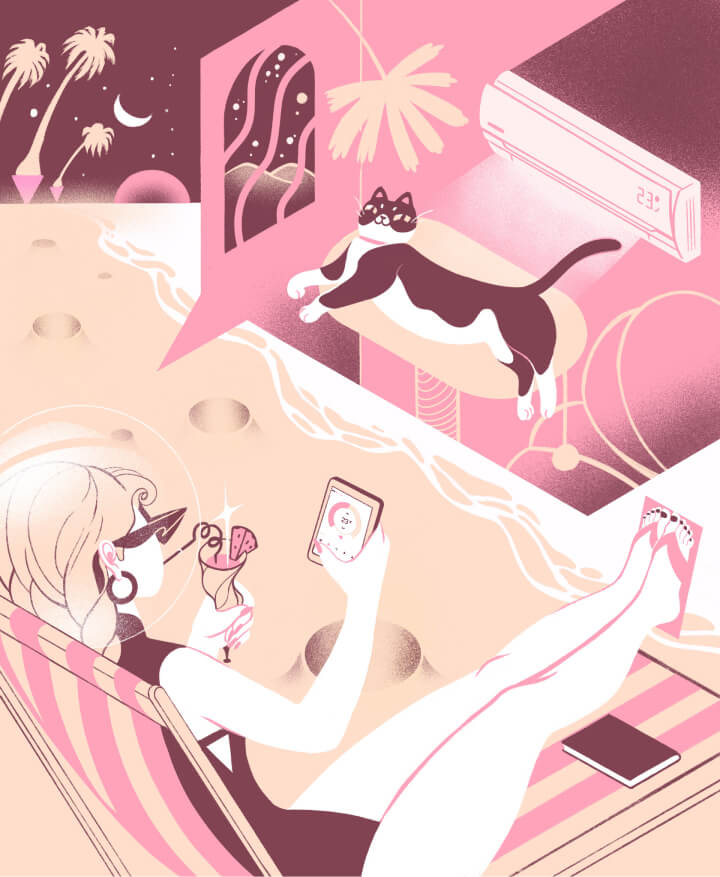 Дистанционное управление кондиционером помогает заботиться о близких, даже когда ты далеко. Герой иллюстрации лежит в шезлонге на пляже. В его руках телефон с открытым приложением Daichi Comfort, на фоне песок, море и шум лунного прибоя. Один клик — и любимый кот, оставленный дома на время межпланетного отпуска, нежится под потоком прохладного воздуха.