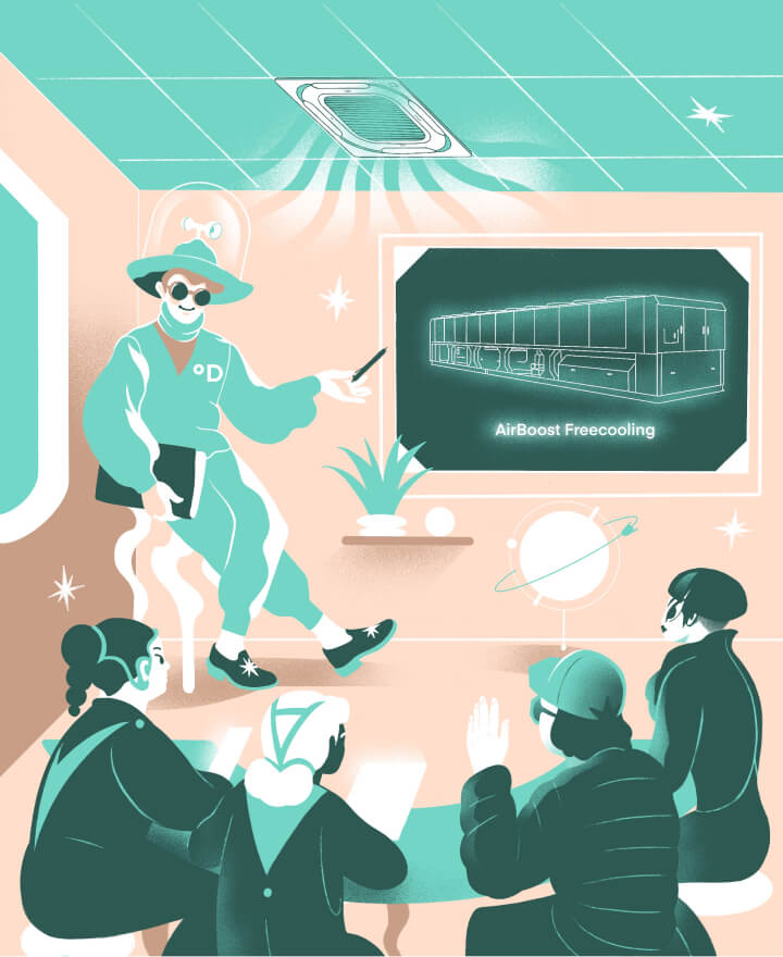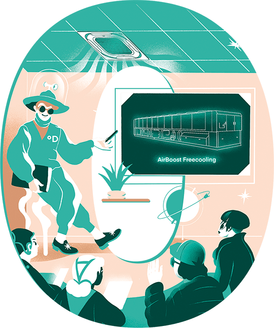На иллюстрации — учебный класс, в потолок встроен фанкойл кассетного типа. Аудитория в классе слушает семинар про чиллеры Midea AirBoost Freecoling от лектора Учебного центра Даичи (одетого в мерч из последней коллекции весна/лето 2124).