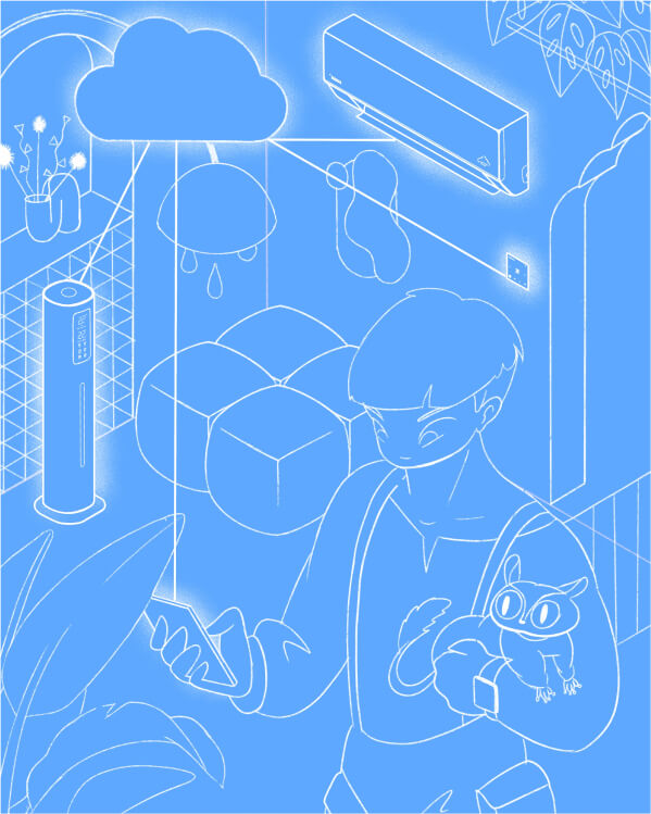 В кадре гостиная, где размещено много климатической техники. На стене висит Облачный кондиционер Daichi Alpha, у двери — пульт управления REM, на полу стоит увлажнитель воздуха. В центре комнаты молодой человек со смартфоном в руках, а над ним парит облако, централизующее умный климат в помещении. Все устройства связаны друг с другом: они управляются по Wi-Fi. Это — экосистема облачных продуктов Даичи.