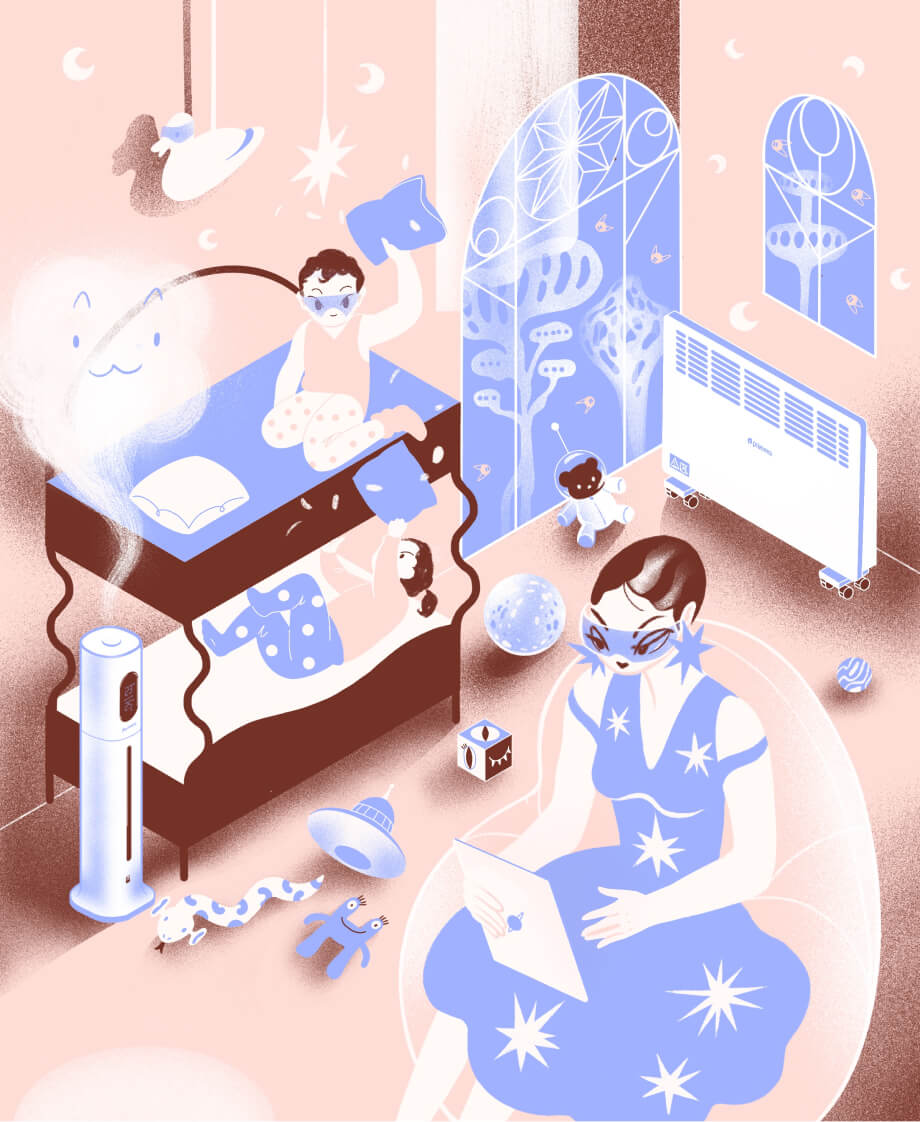 Уютная детская, мама читает книгу про звездных пиратов, и бой на подушках превращается во взятие на абордаж космического галеона в дополненной реальности. Конвектор у окна создаёт в помещении тепло, а увлажнитель воздуха поддерживает влажность для комфорта всей семьи.